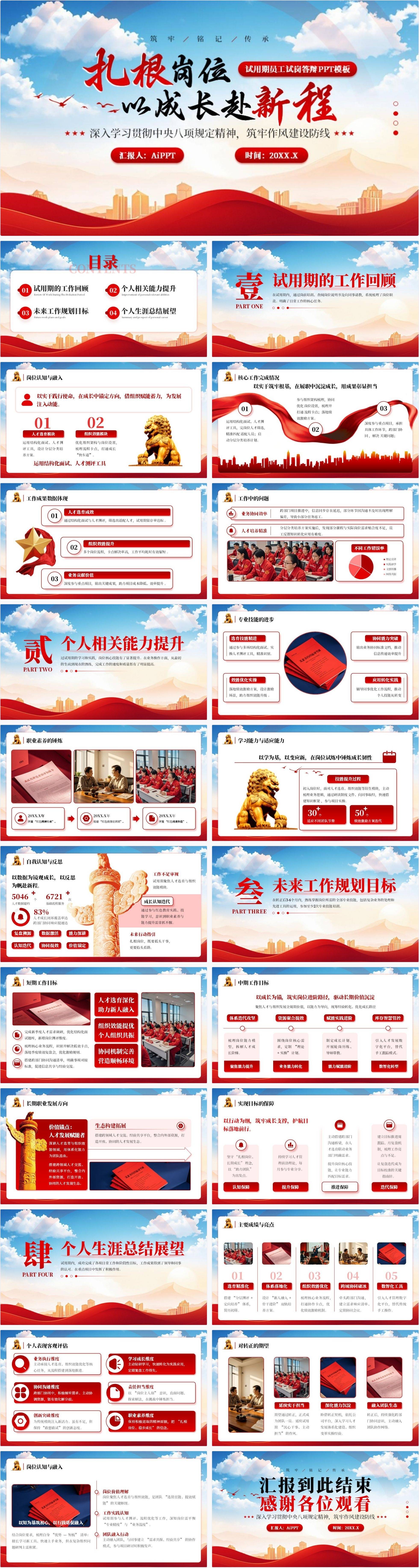 国企/事业单位首选方案,融合传统纹样与现代商务元素。特色包含党建融合工作汇报页、传统文化传承成果展示区、红色教育参与度仪表盘。独创"德能勤绩廉"五维评估体系,内置政策文件引用规范库,完美适配体制内转正答辩场景。金黄镶边设计彰显庄重感,页面动画保持克制专业度。