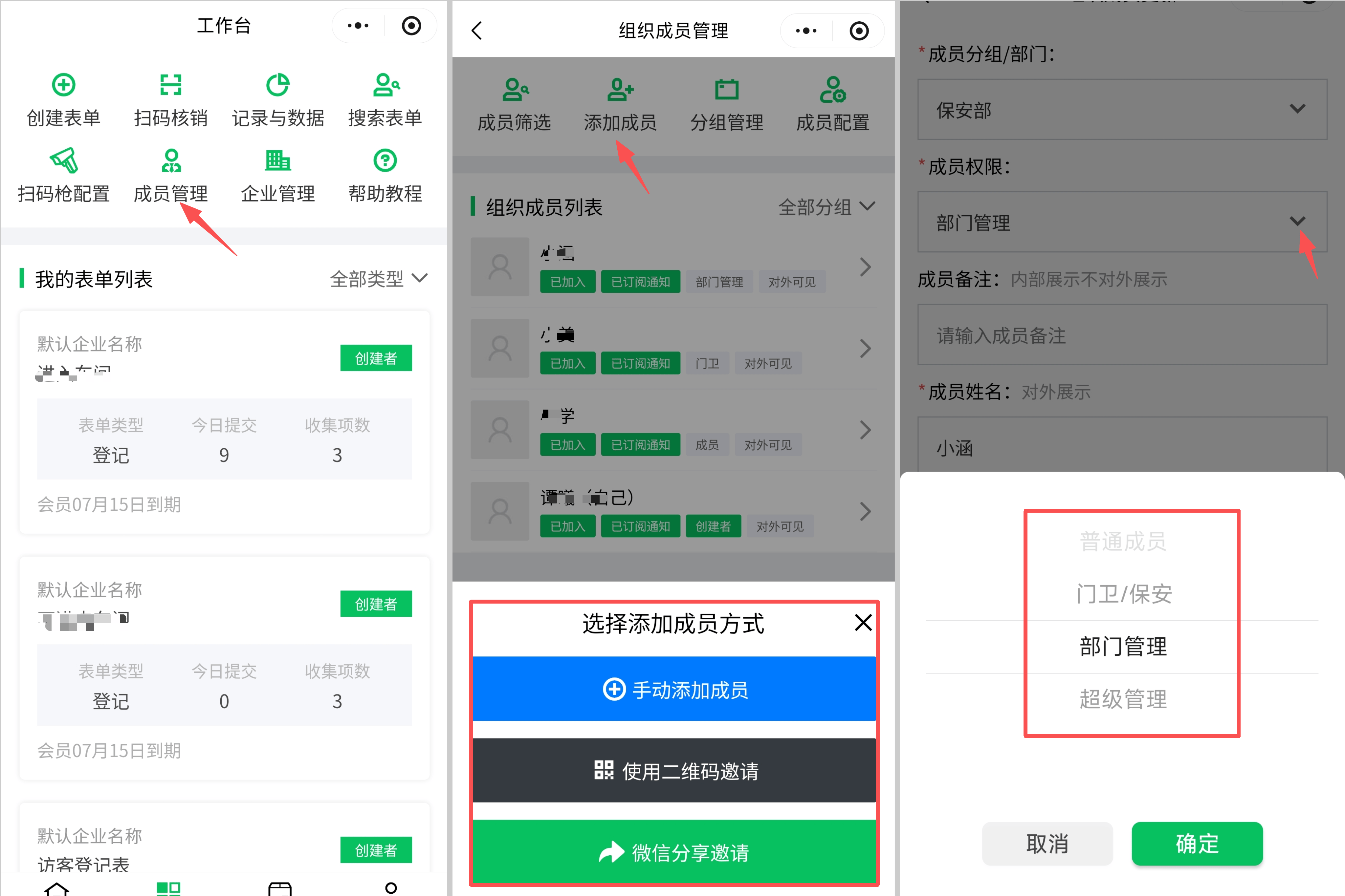 首先,管理员登录访客宝小程序,进入“成员管理”模块,通过微信分享邀请需同步信息的成员,完成信息录入并确认成员订阅推送消息。