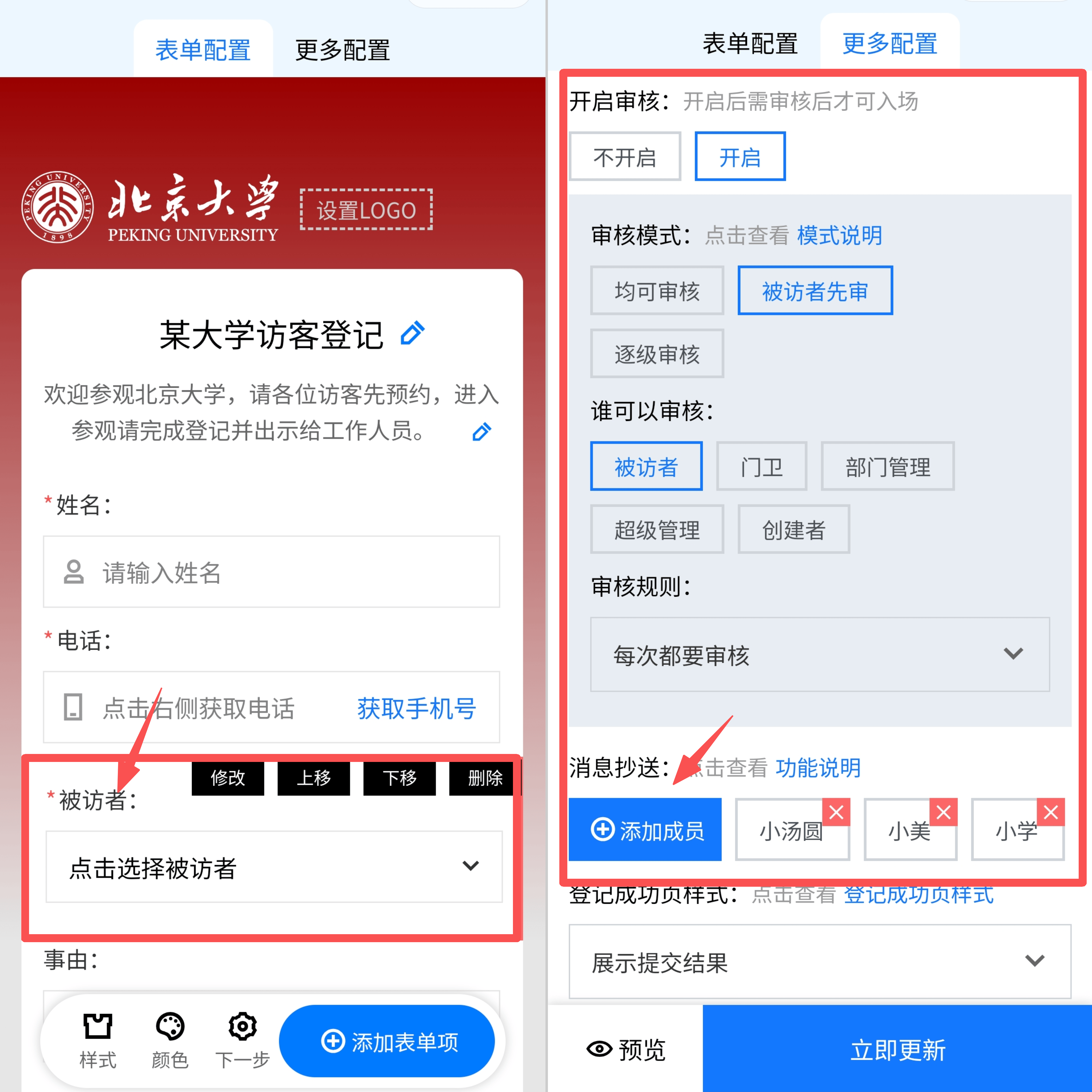 随后,在创建访客登记表单时,添加“被访者组件”,开启审核功能并选择“被访者先审”模式,同时勾选需同步信息的其他成员角色,明确推送范围。